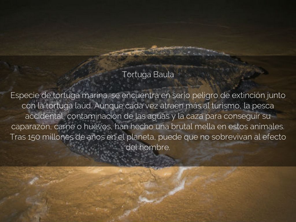 Especie de tortuga marina, se encuentra en serio peligro de extinción junto con la tortuga laúd. Aunque cada vez atraen más al turismo, la pesca accidental, contaminación de las aguas y la caza para conseguir su caparazón, carne o huevos, han hecho una brutal mella en estos animales.