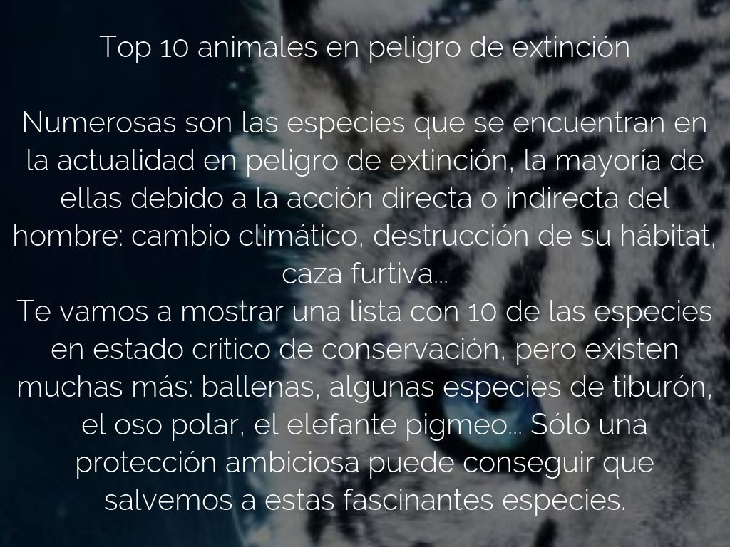 Te vamos a mostrar una lista con 10 de las especies en estado crítico de conservación, pero existen muchas más: ballenas, algunas especies de tiburón, el oso polar, el elefante pigmeo... Sólo una protección ambiciosa puede conseguir que salvemos a estas fascinantes especies.