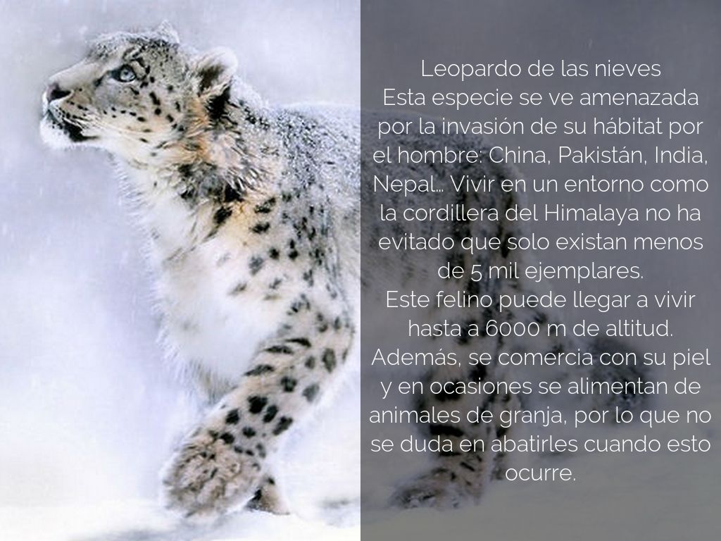 Este felino puede llegar a vivir hasta a 6000 m de altitud. Además, se comercia con su piel y en ocasiones se alimentan de animales de granja, por lo que no se duda en abatirles cuando esto ocurre.