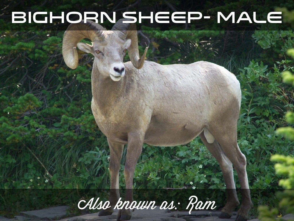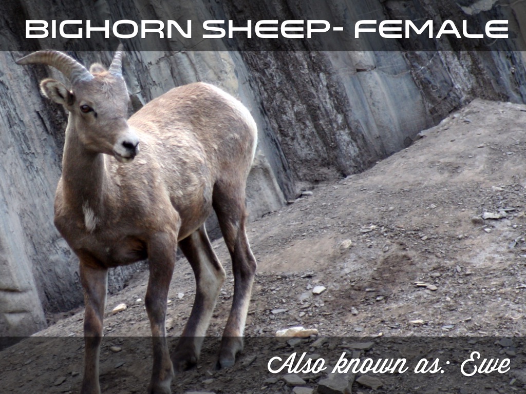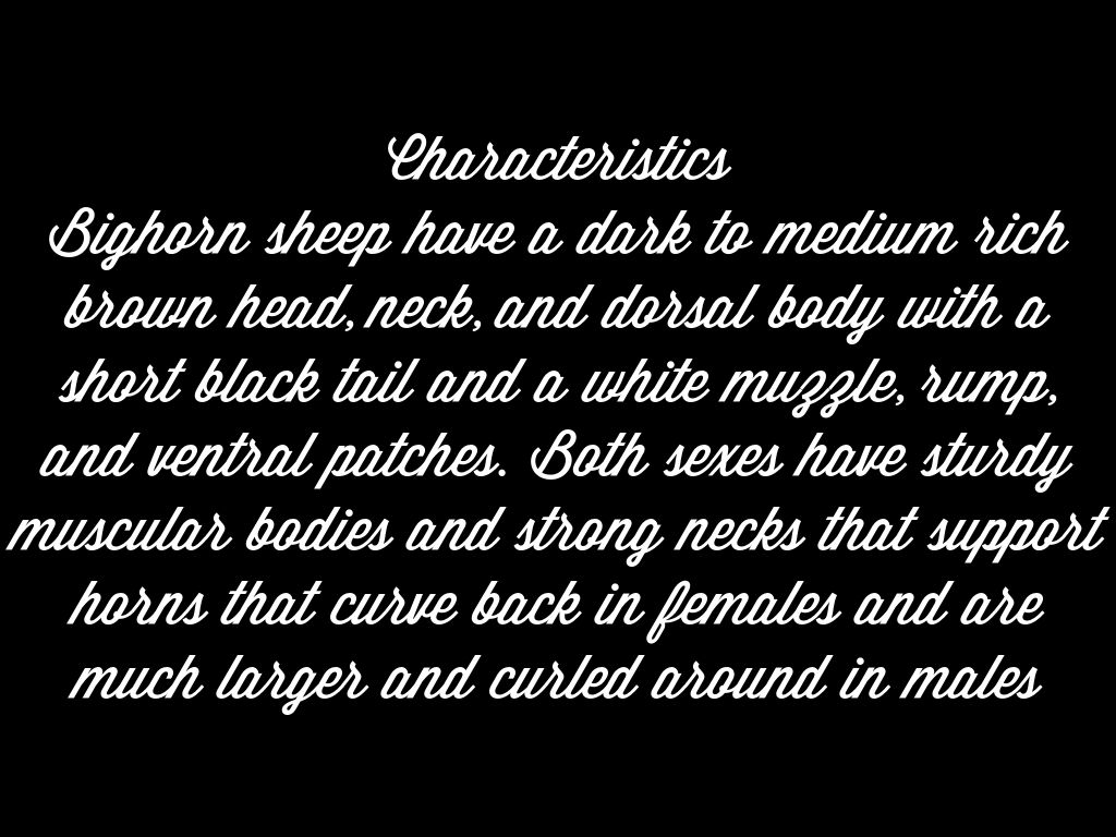 Bighorn sheep have a dark to medium rich brown head, neck, and dorsal body with a short black tail and a white muzzle, rump, and ventral patches. Both sexes have sturdy muscular bodies and strong necks that support horns that curve back in females and are much larger and curled around in males