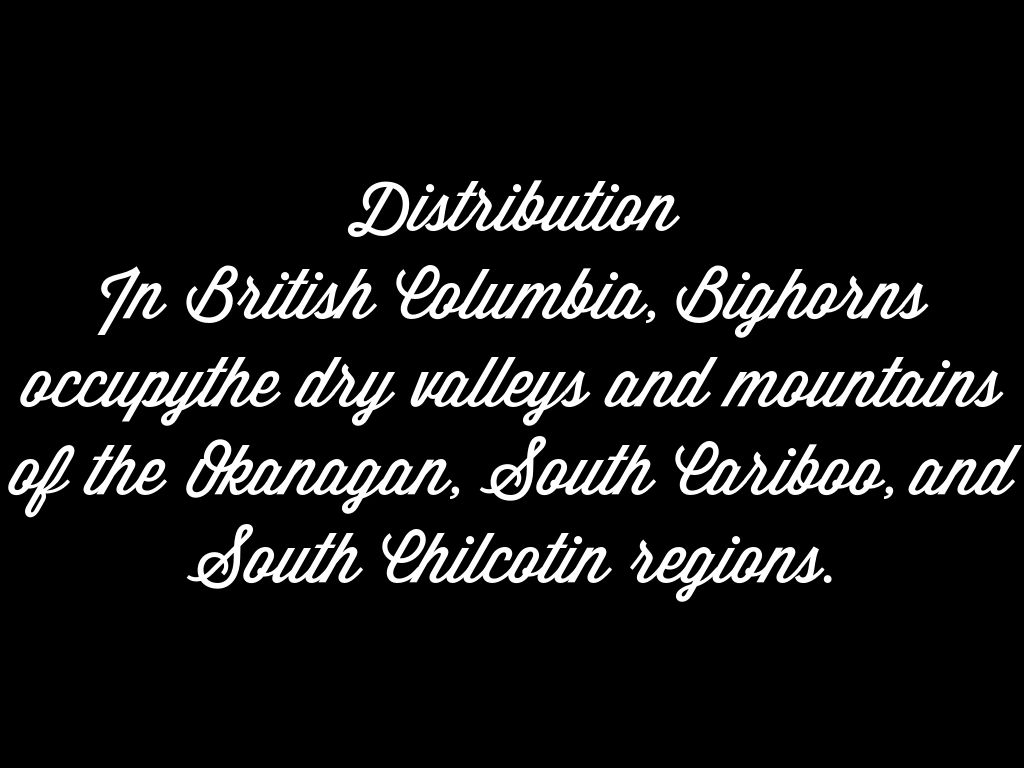 In British Columbia, Bighorns occupythe dry valleys and mountains of the Okanagan, South Cariboo, and South Chilcotin regions.