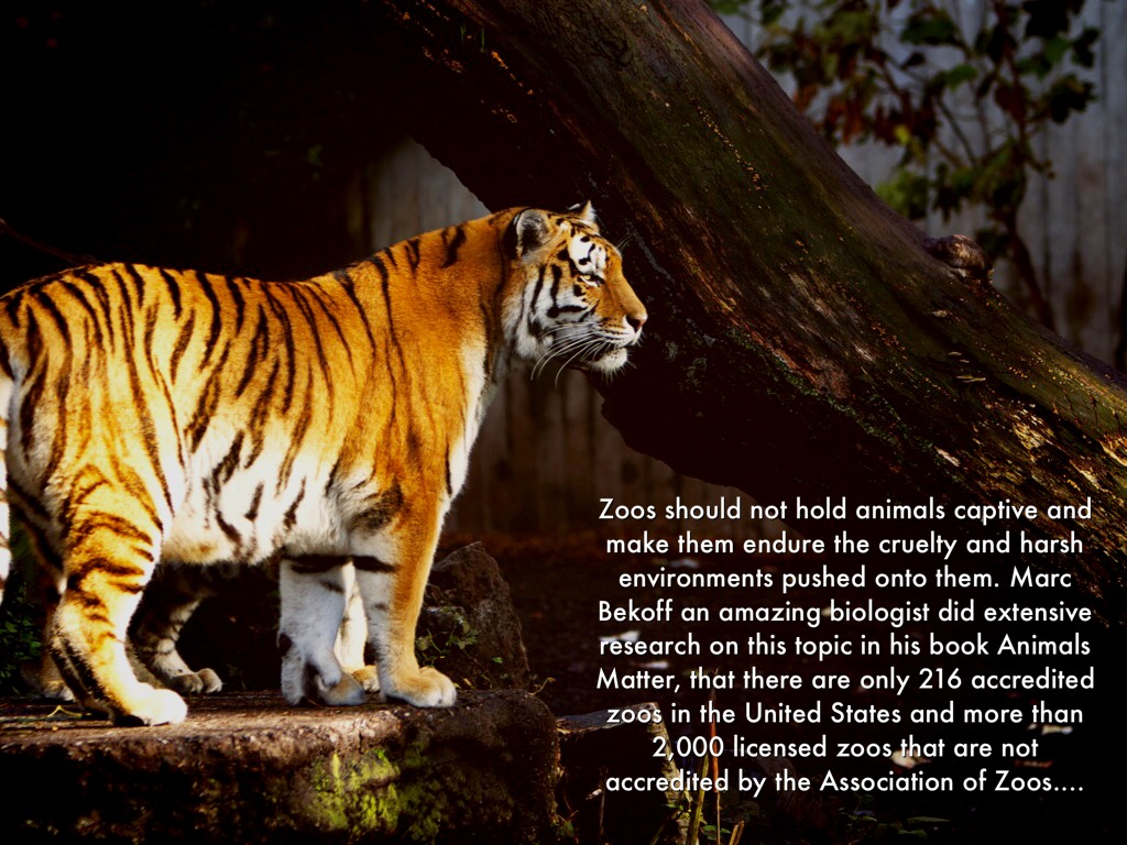Zoos should not hold animals captive and make them endure the cruelty and harsh environments pushed onto them. Marc Bekoff an amazing biologist did extensive research on this topic in his book Animals Matter, that there are only 216 accredited zoos in the United States and more than 2,000 licensed zoos that are not accredited by the Association of Zoos.