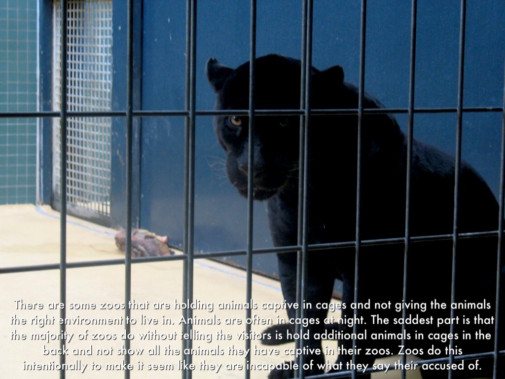There are some zoos that are holding animals captive in cages and not giving the animals the right environment to live in. Animals are often in cages at night. The saddest part is that the majority of zoos do without telling the visitors is hold additional animals in cages in the back and not show all the animals they have captive in their zoos. Zoos do this intentionally to make it seem like they are incapable of what they say their accused of.