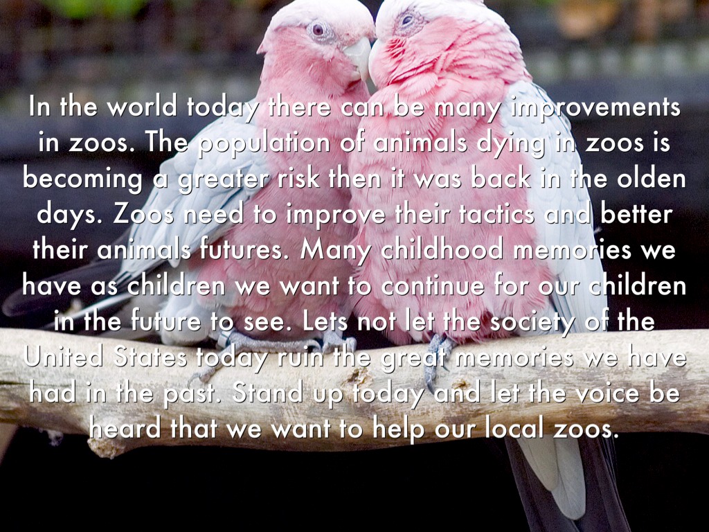 In the world today there can be many improvements in zoos. The population of animals dying in zoos is becoming a greater risk then it was back in the olden days. Zoos need to improve their tactics and better their animals futures. Many childhood memories we have as children we want to continue for our children in the future to see. Lets not let the society of the United States today ruin the great memories we have had in the past. Stand up today and let the voice be heard that we want to help our local zoos.