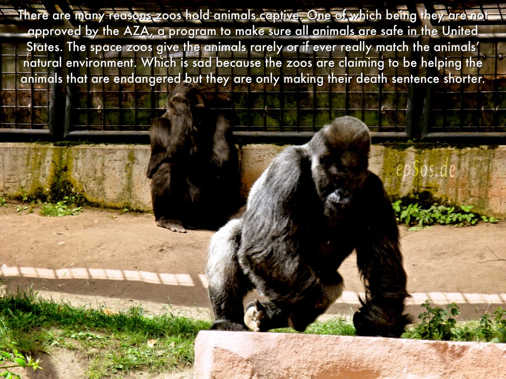 There are many reasons zoos hold animals captive. One of which being they are not approved by the AZA, a program to make sure all animals are safe in the United States. The space zoos give the animals rarely or if ever really match the animals’ natural environment. Which is sad because the zoos are claiming to be helping the animals that are endangered but they are only making their death sentence shorter.