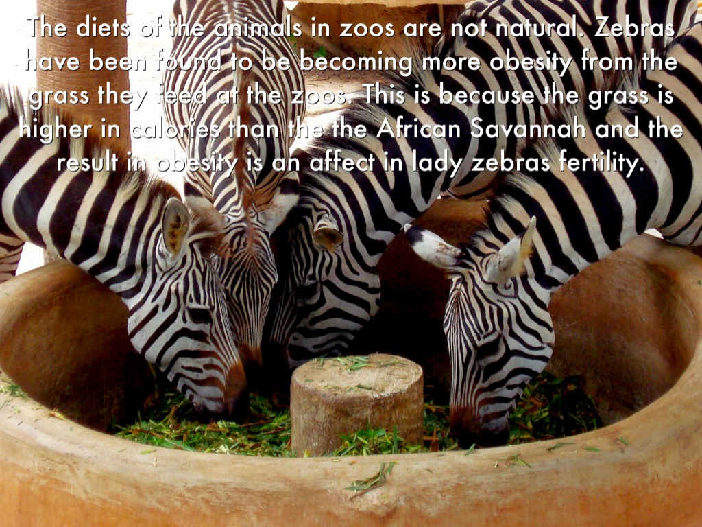 The diets of the animals in zoos are not natural. Zebras have been found to be becoming more obesity from the grass they feed at the zoos. This is because the grass is higher in calories than the the African Savannah and the result in obesity is an affect in lady zebras fertility.