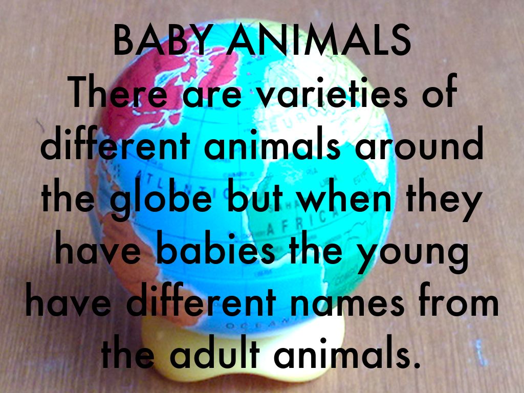 BABY ANIMALS There are varieties of different animals around the globe but when they have babies the young have different names from the adult animals.