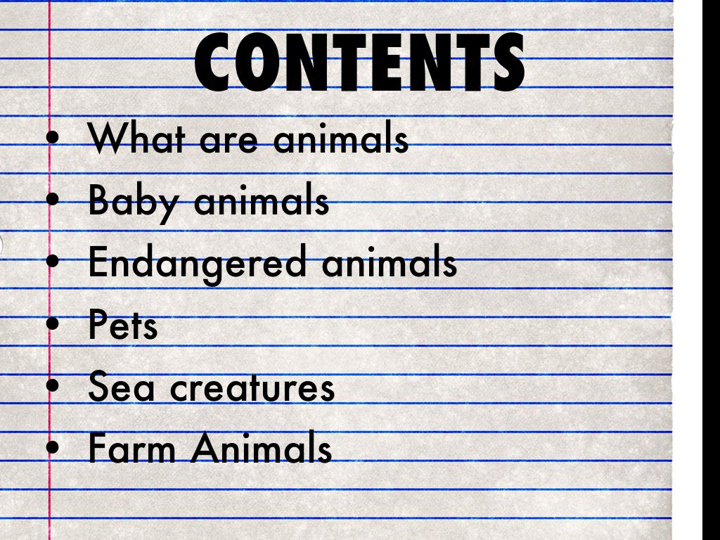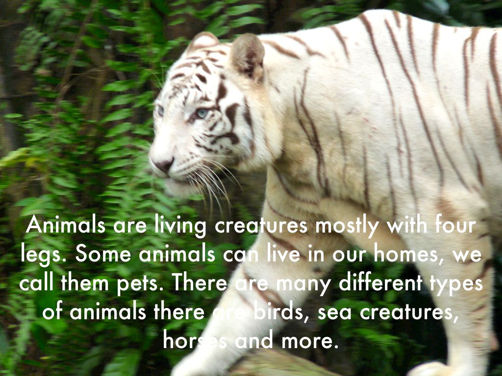 Animals are living creatures mostly with four legs. Some animals can live in our homes, we call them pets. There are many different types of animals there are birds, sea creatures, horses and more.