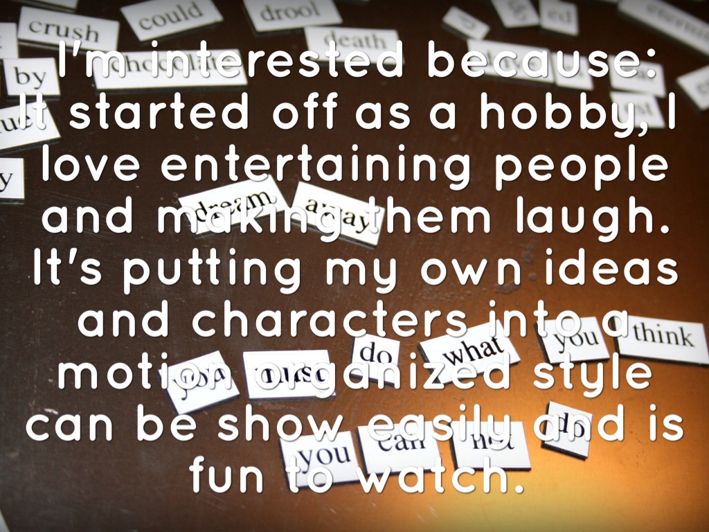 It started off as a hobby, I love entertaining people and making them laugh. It's putting my own ideas and characters into a motion organized style can be show easily and is fun to watch.