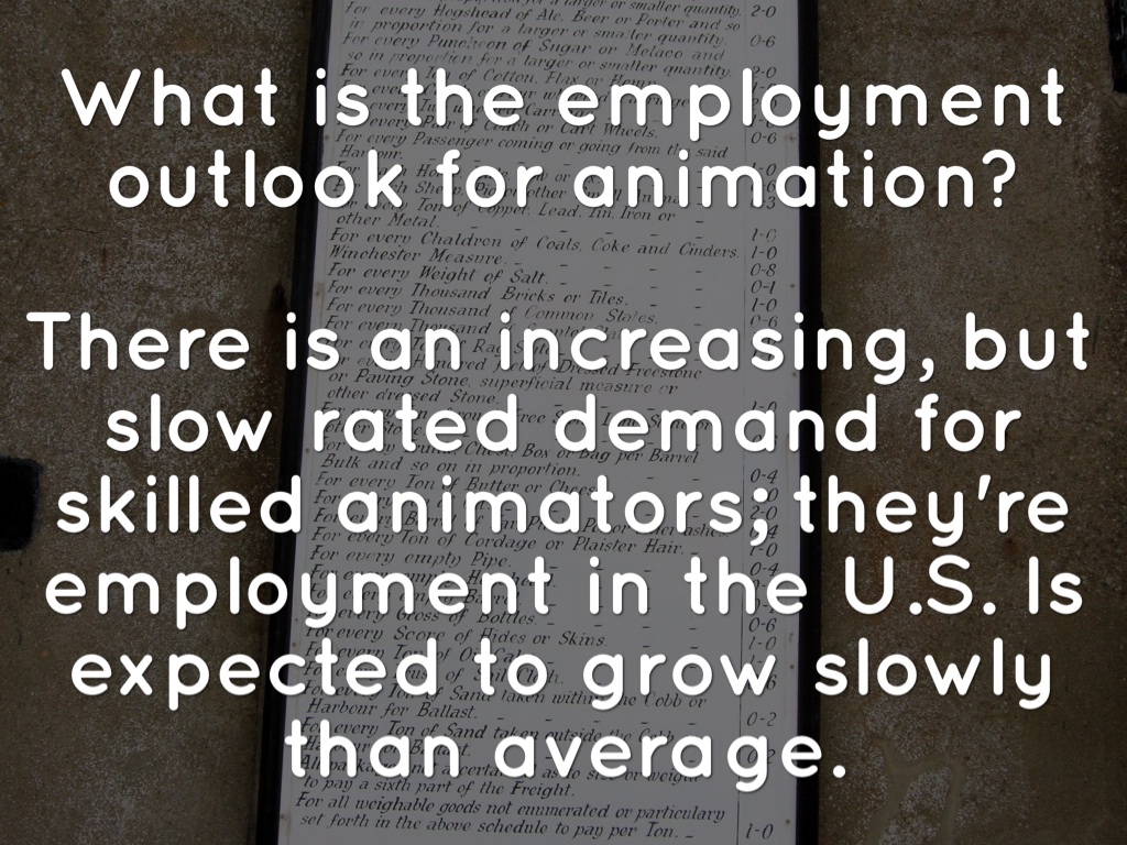 There is an increasing, but slow rated demand for skilled animators; they're employment in the U.S. Is expected to grow slowly than average.