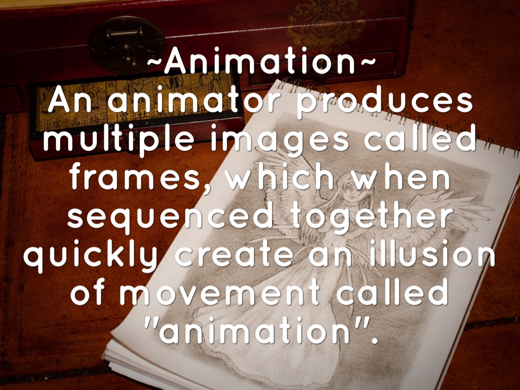 An animator produces multiple images called frames, which when sequenced together quickly create an illusion of movement called "animation".