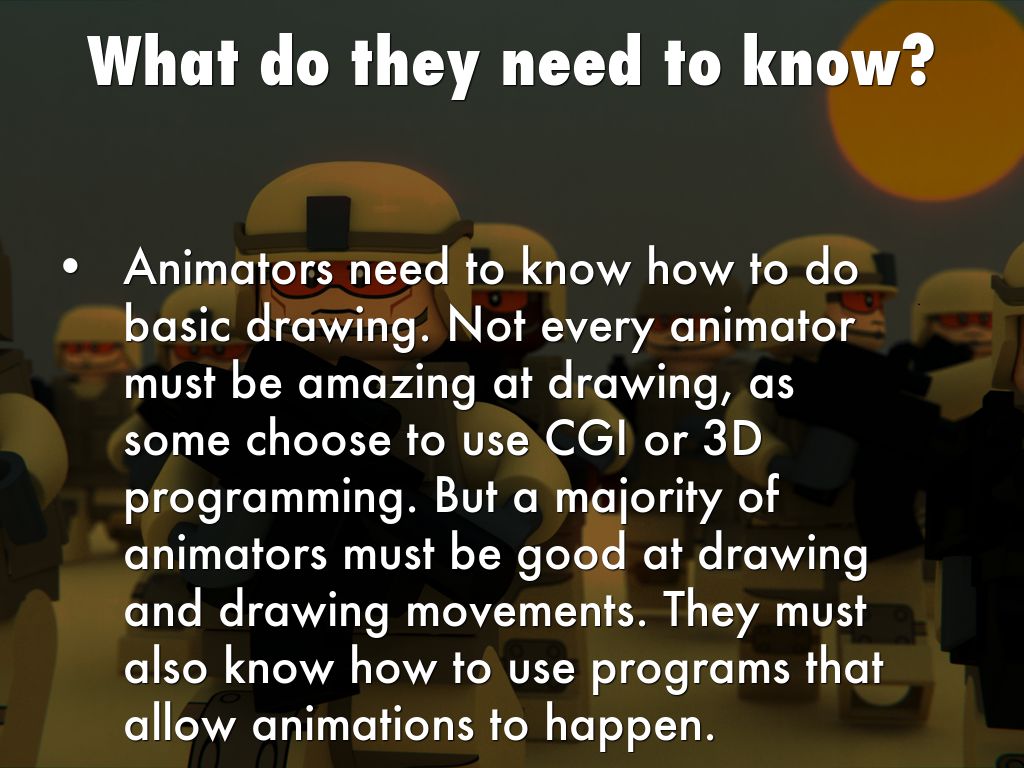 Animators need to know how to do basic drawing. Not every animator must be amazing at drawing, as some choose to use CGI or 3D programming. But a majority of animators must be good at drawing and drawing movements. They must also know how to use programs that allow animations to happen.