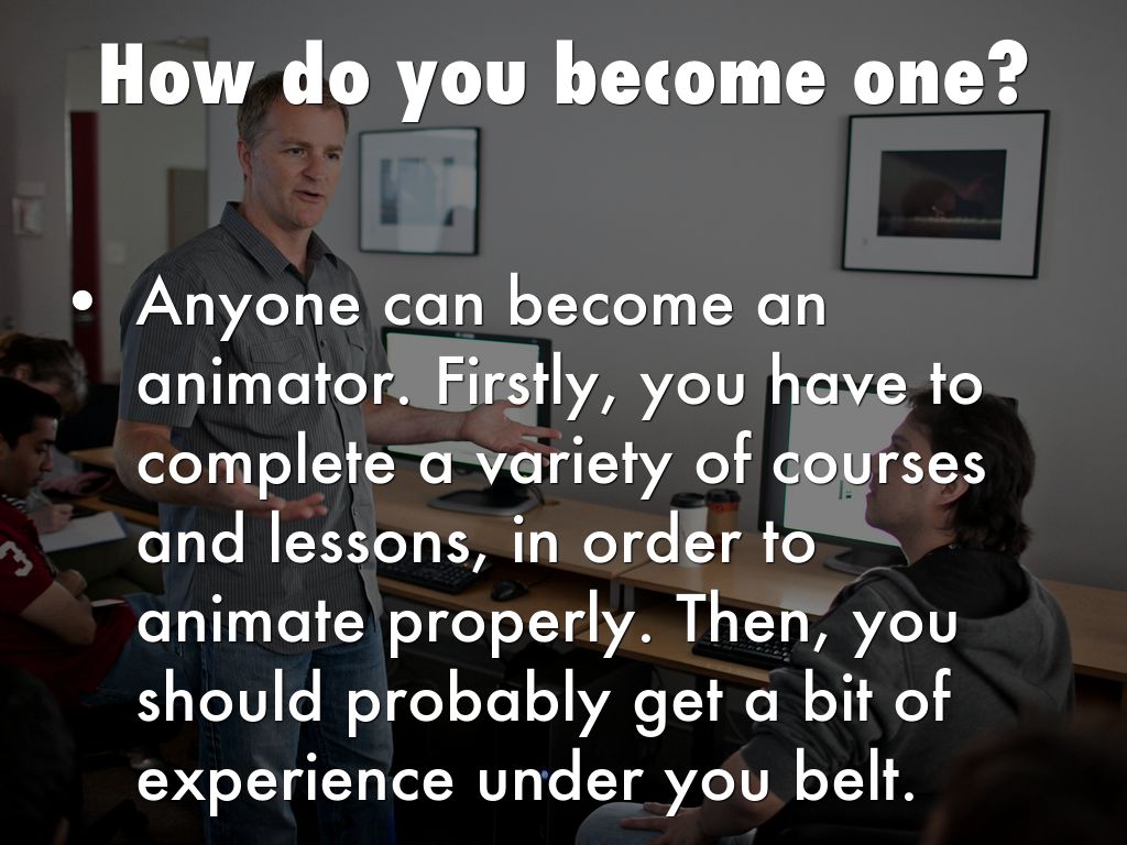 Anyone can become an animator. Firstly, you have to complete a variety of courses and lessons, in order to animate properly. Then, you should probably get a bit of experience under you belt.