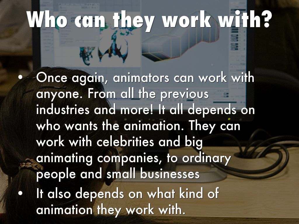 Once again, animators can work with anyone. From all the previous industries and more! It all depends on who wants the animation. They can work with celebrities and big animating companies, to ordinary people and small businesses