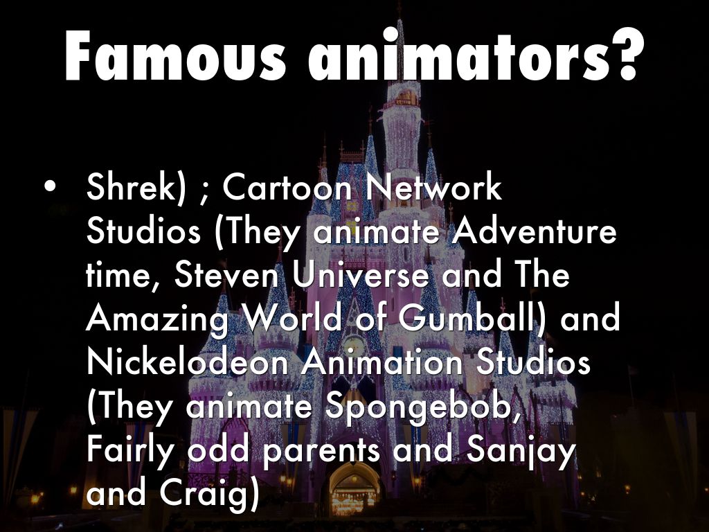 Shrek) ; Cartoon Network Studios (They animate Adventure time, Steven Universe and The Amazing World of Gumball) and Nickelodeon Animation Studios (They animate Spongebob, Fairly odd parents and Sanjay and Craig)