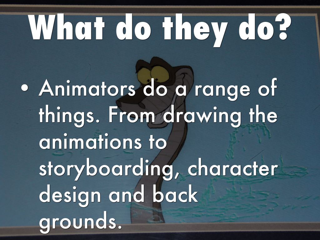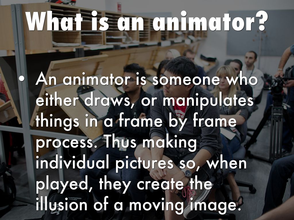 An animator is someone who either draws, or manipulates things in a frame by frame process. Thus making individual pictures so, when played, they create the illusion of a moving image.