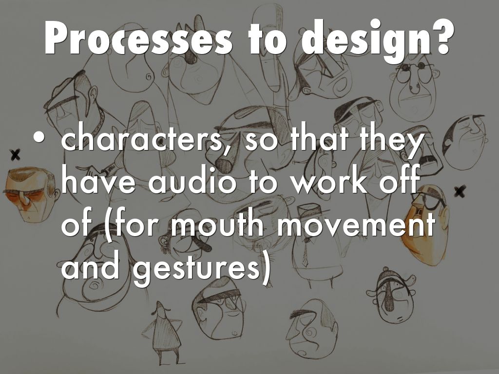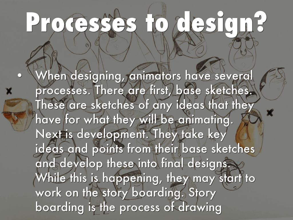 When designing, animators have several processes. There are first, base sketches. These are sketches of any ideas that they have for what they will be animating. Next is development. They take key ideas and points from their base sketches and develop these into final designs. While this is happening, they may start to work on the story boarding. Story boarding is the process of drawing sketches of main gestures so they have a general idea of what will be happening in that scene and what dialogue will be spoken, or actions preformed. After this, they can begin work on the animation once everything has been cleared. During the drawing and animating process, or even before, they will look for voices to voice act the characters, so that they have audio to work off of (for mouth movement and gestures)