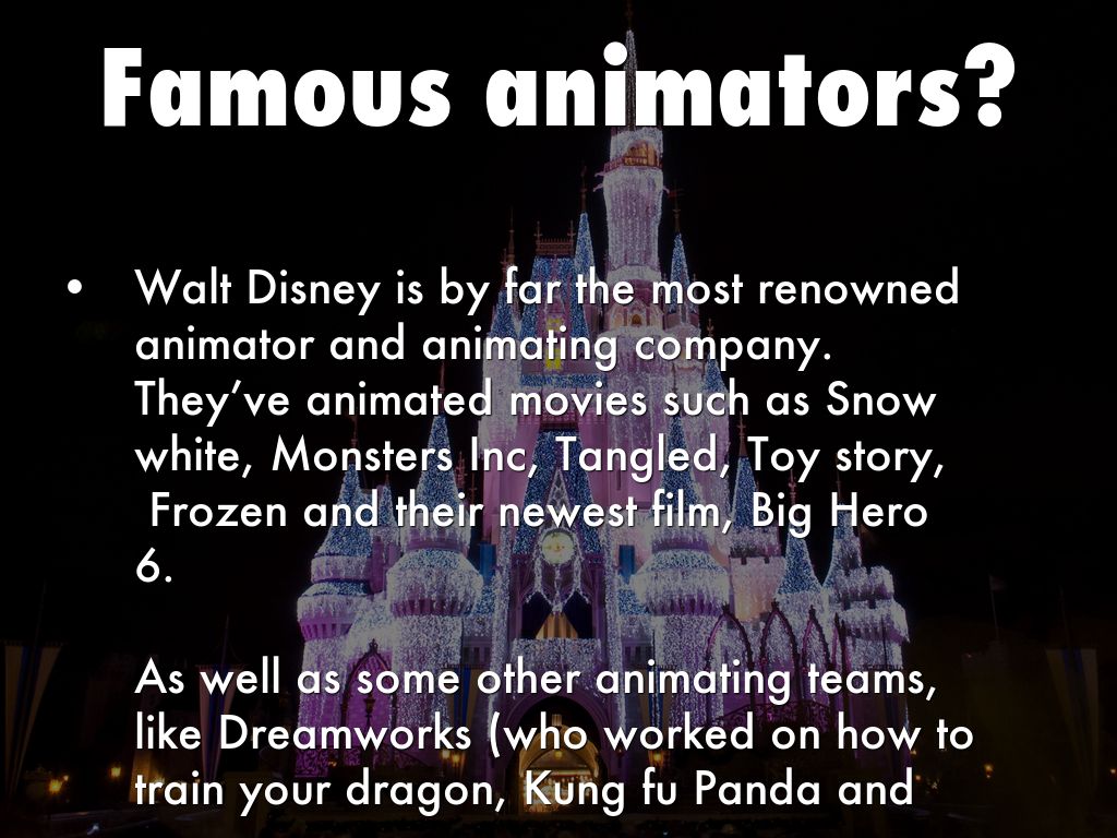 Walt Disney is by far the most renowned animator and animating company. They’ve animated movies such as Snow white, Monsters Inc, Tangled, Toy story, Frozen and their newest film, Big Hero 6.