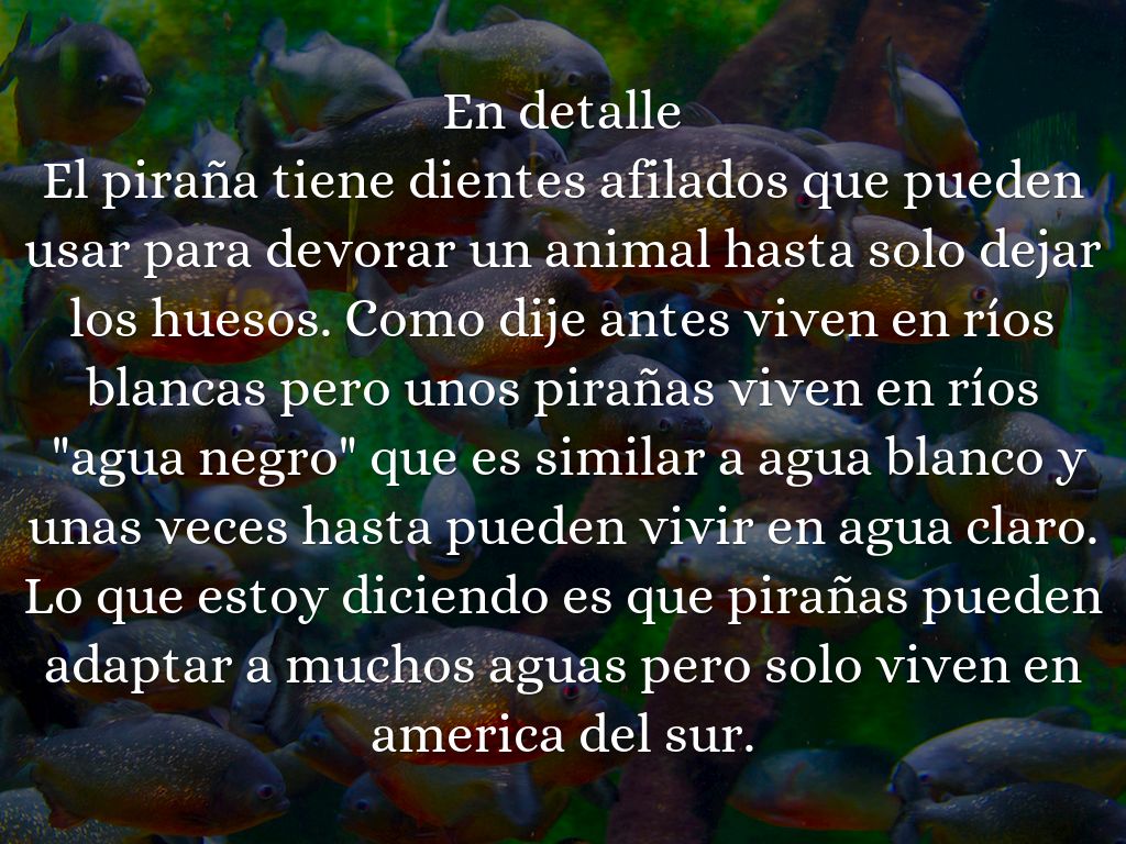 En detalle El piraña tiene dientes afilados que pueden usar para devorar un animal hasta solo dejar los huesos. Como dije antes viven en ríos blancas pero unos pirañas viven en ríos "agua negro" que es similar a agua blanco y unas veces hasta pueden vivir en agua claro. Lo que estoy diciendo es que pirañas pueden adaptar a muchos aguas pero solo viven en america del sur.