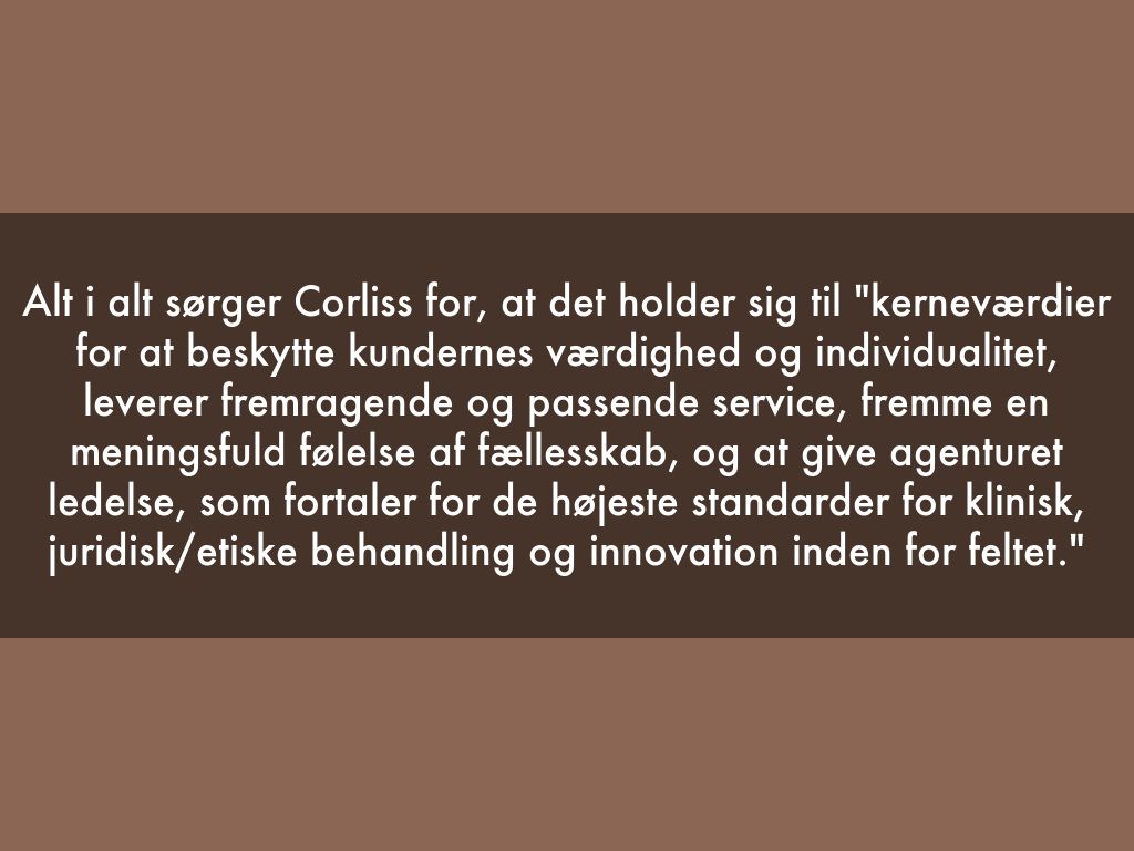 Alt i alt sørger Corliss for, at det holder sig til "kerneværdier for at beskytte kundernes værdighed og individualitet, leverer fremragende og passende service, fremme en meningsfuld følelse af fællesskab, og at give agenturet ledelse, som fortaler for de højeste standarder for klinisk, juridisk/etiske behandling og innovation inden for feltet."