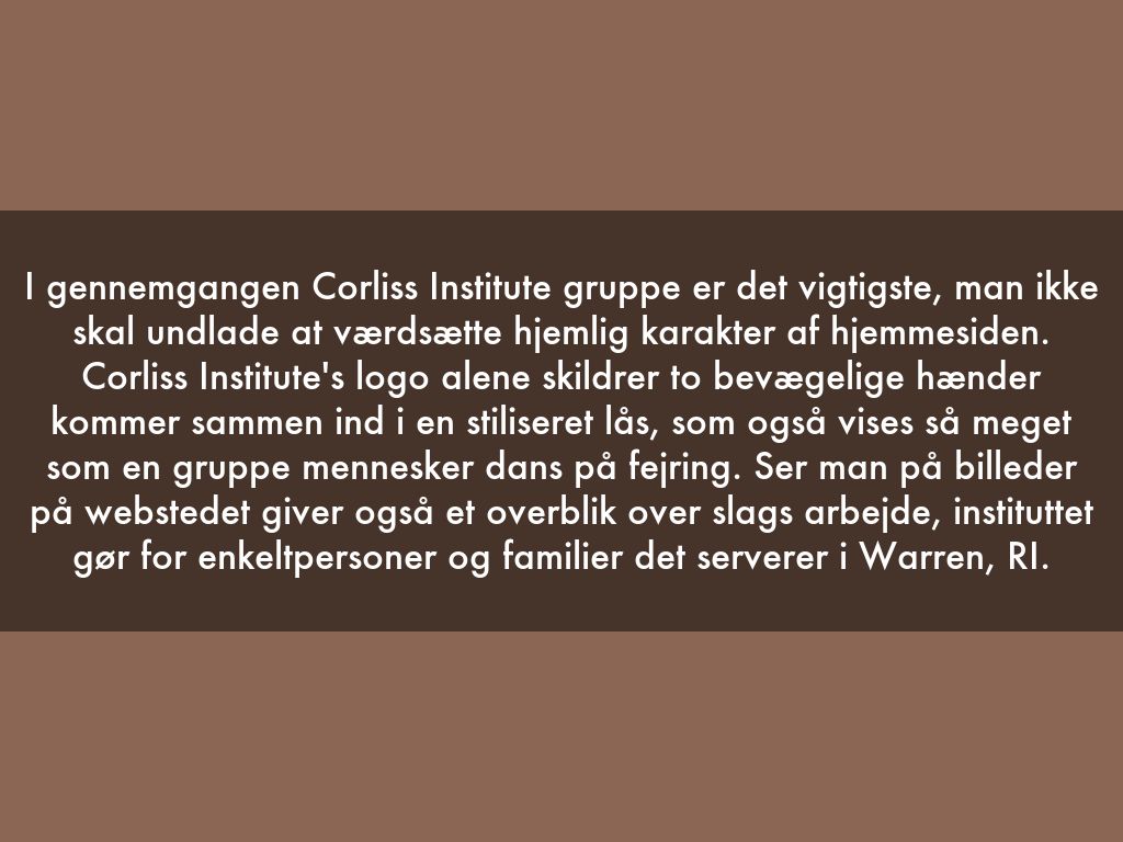 I gennemgangen Corliss Institute gruppe er det vigtigste, man ikke skal undlade at værdsætte hjemlig karakter af hjemmesiden. Corliss Institute's logo alene skildrer to bevægelige hænder kommer sammen ind i en stiliseret lås, som også vises så meget som en gruppe mennesker dans på fejring. Ser man på billeder på webstedet giver også et overblik over slags arbejde, instituttet gør for enkeltpersoner og familier det serverer i Warren, RI.