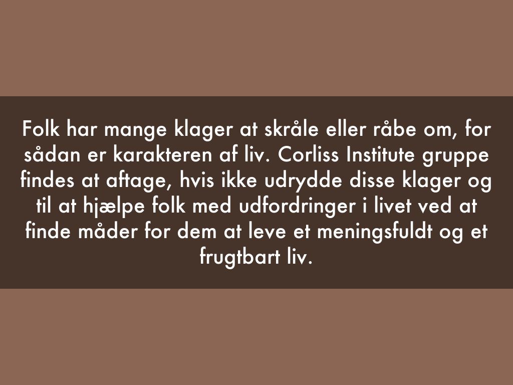 Folk har mange klager at skråle eller råbe om, for sådan er karakteren af liv. Corliss Institute gruppe findes at aftage, hvis ikke udrydde disse klager og til at hjælpe folk med udfordringer i livet ved at finde måder for dem at leve et meningsfuldt og et frugtbart liv.