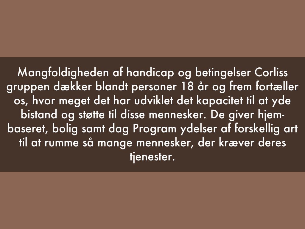 Mangfoldigheden af handicap og betingelser Corliss gruppen dækker blandt personer 18 år og frem fortæller os, hvor meget det har udviklet det kapacitet til at yde bistand og støtte til disse mennesker. De giver hjem-baseret, bolig samt dag Program ydelser af forskellig art til at rumme så mange mennesker, der kræver deres tjenester.