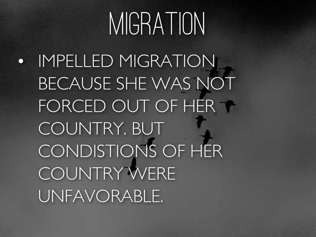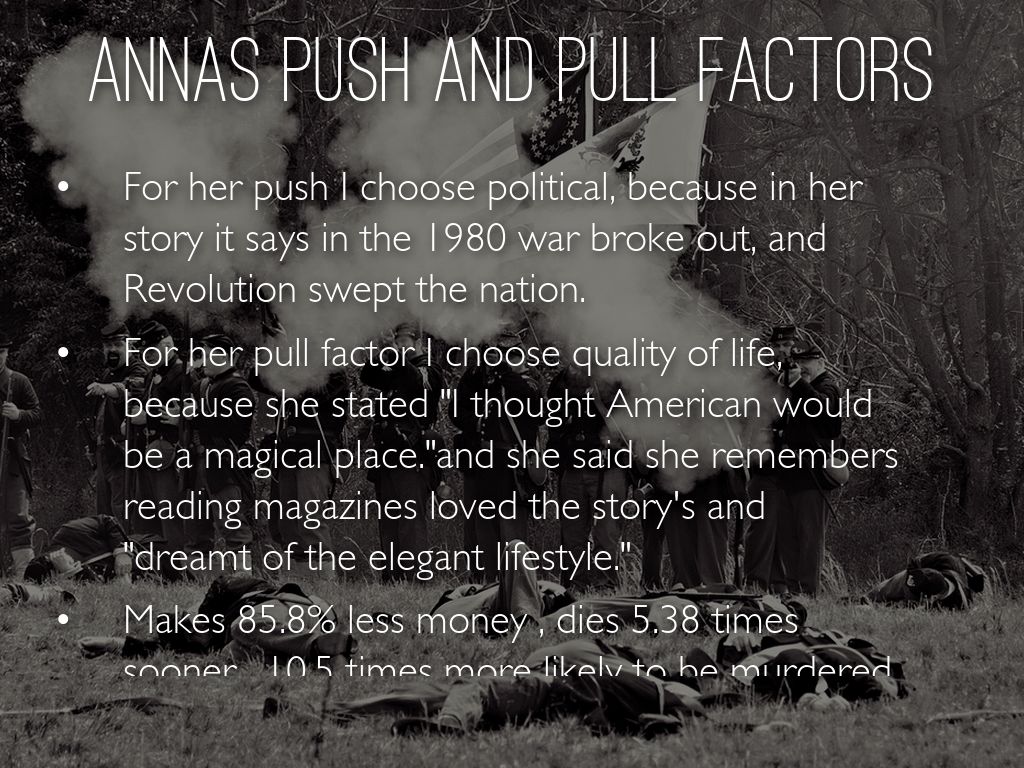 For her pull factor I choose quality of life, because she stated "I thought American would be a magical place."and she said she remembers reading magazines loved the story's and "dreamt of the elegant lifestyle."