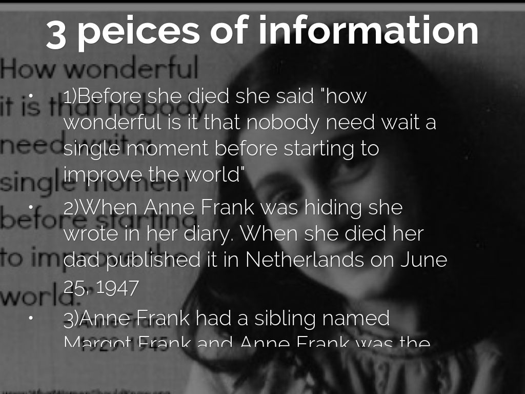 3)Anne Frank had a sibling named Margot Frank and Anne Frank was the youngest.They both died on March 9,1945. Margot died when she was 19 and Anne Frank was 16.