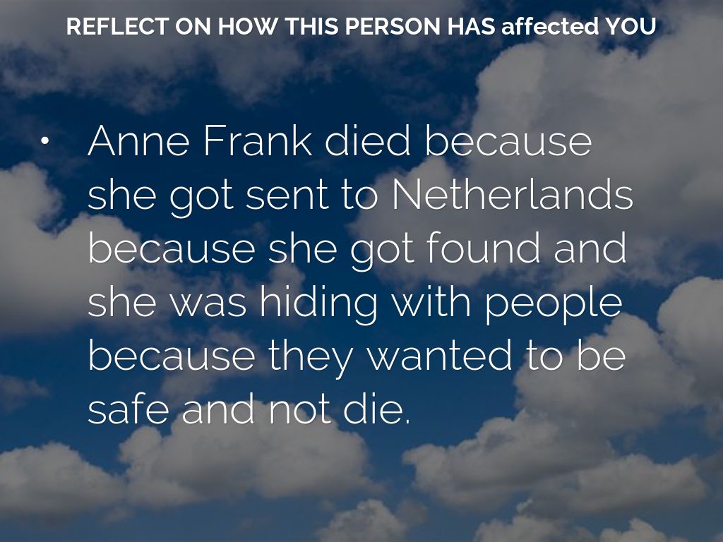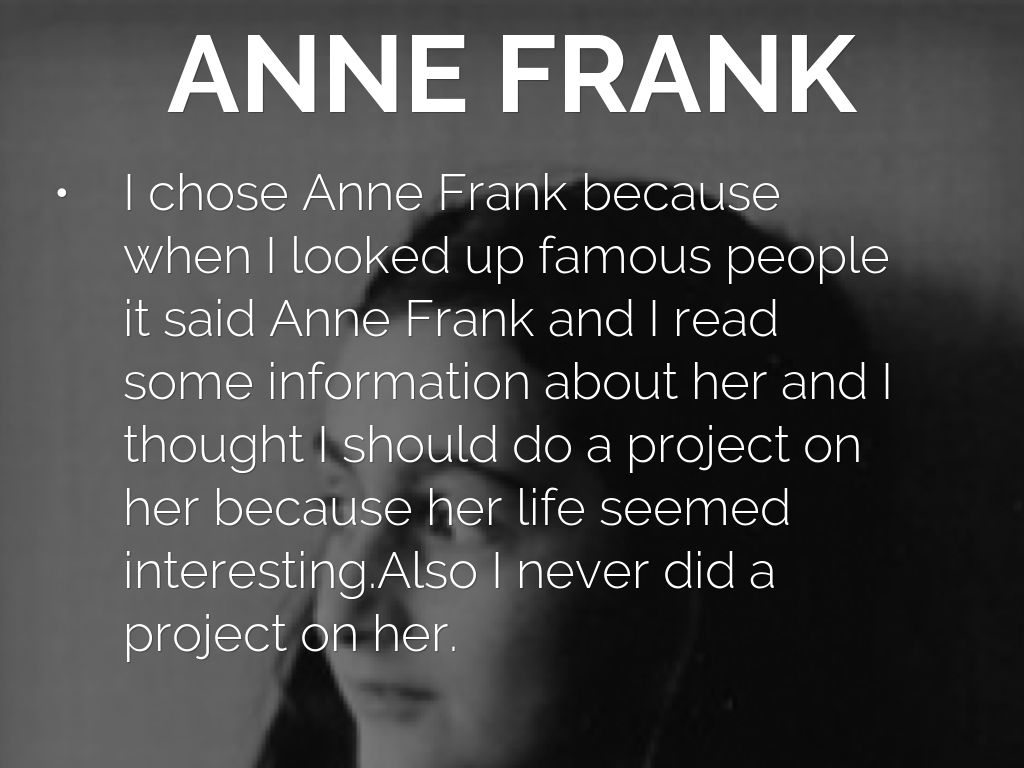 I chose Anne Frank because when I looked up famous people it said Anne Frank and I read some information about her and I thought I should do a project on her because her life seemed interesting.Also I never did a project on her.