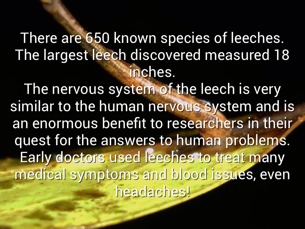 There are 650 known species of leeches. The largest leech discovered measured 18 inches. The nervous system of the leech is very similar to the human nervous system and is an enormous benefit to researchers in their quest for the answers to human problems. Early doctors used leeches to treat many medical symptoms and blood issues, even headaches!
