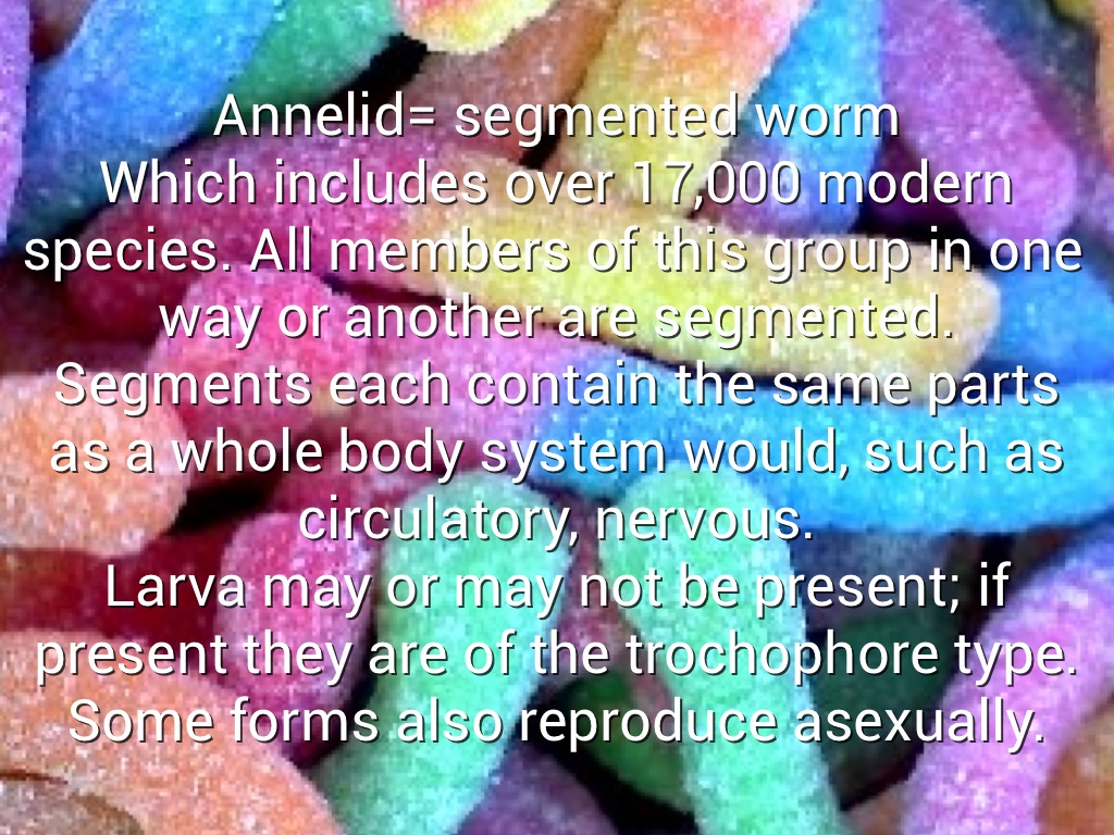 Annelid= segmented worm Which includes over 17,000 modern species. All members of this group in one way or another are segmented. Segments each contain the same parts as a whole body system would, such as circulatory, nervous. Larva may or may not be present; if present they are of the trochophore type. Some forms also reproduce asexually.