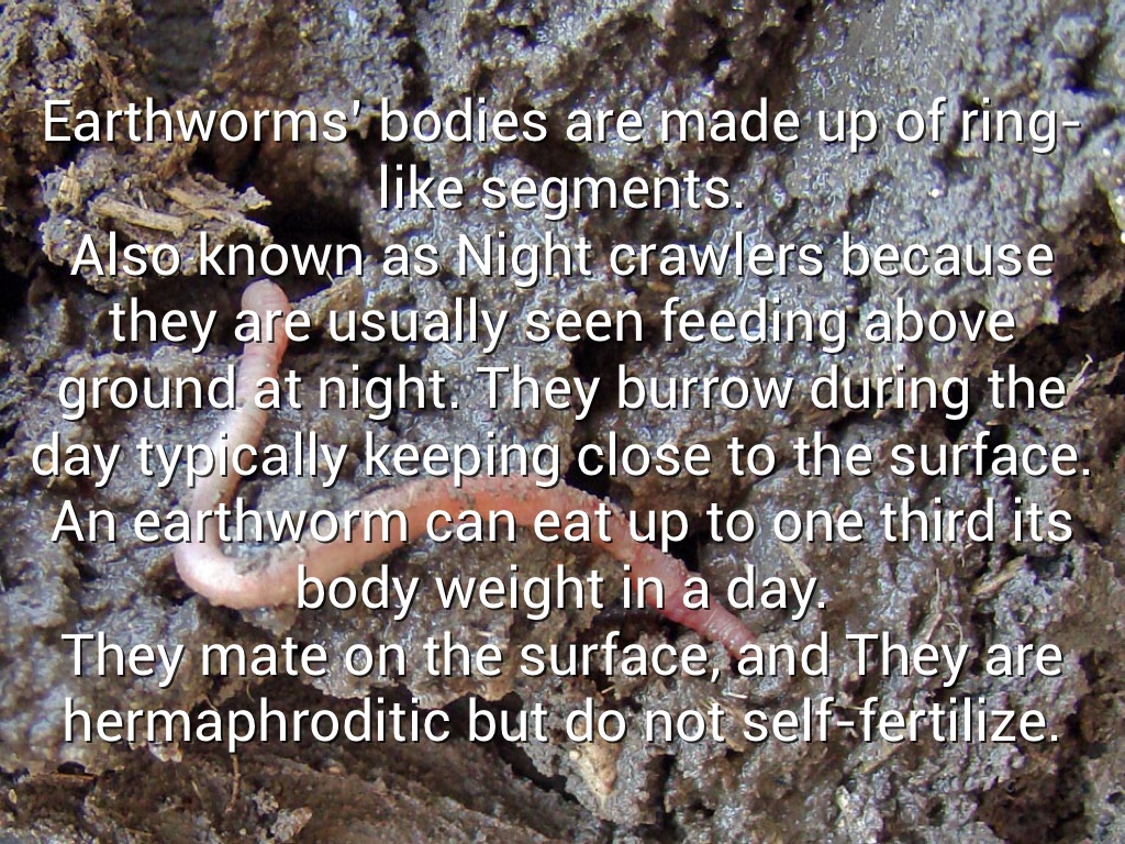 Earthworms’ bodies are made up of ring-like segments. Also known as Night crawlers because they are usually seen feeding above ground at night. They burrow during the day typically keeping close to the surface. An earthworm can eat up to one third its body weight in a day. They mate on the surface, and They are hermaphroditic but do not self-fertilize.
