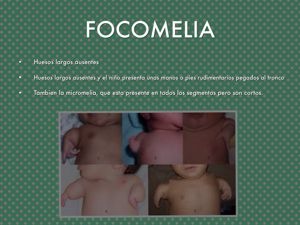 Huesos largos ausentes y el niño presenta unas manos o pies rudimentarios pegados al tronco