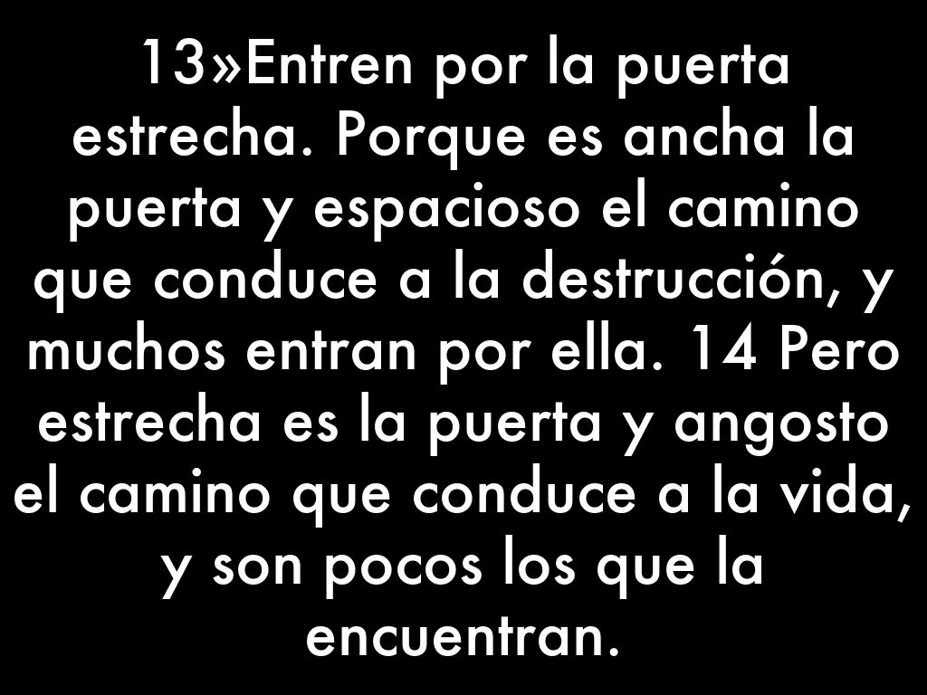 13»Entren por la puerta estrecha. Porque es ancha la puerta y espacioso el camino que conduce a la destrucción, y muchos entran por ella. 14 Pero estrecha es la puerta y angosto el camino que conduce a la vida, y son pocos los que la encuentran.