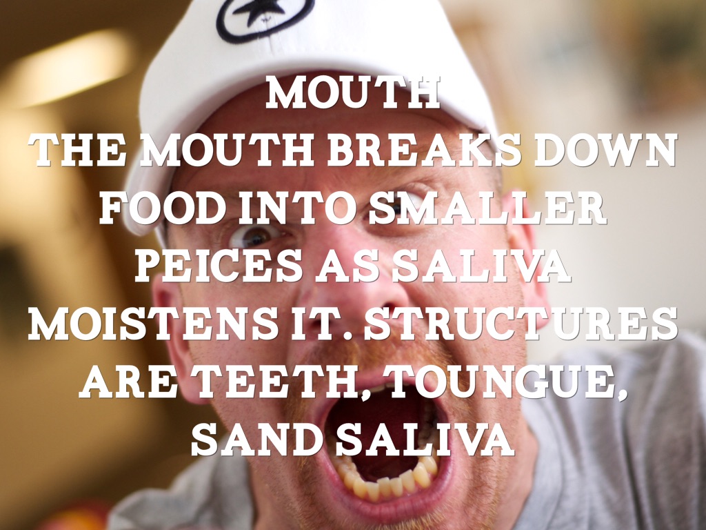 the mouth breaks down food into smaller peices as saliva moistens it. structures are teeth, toungue, sand saliva