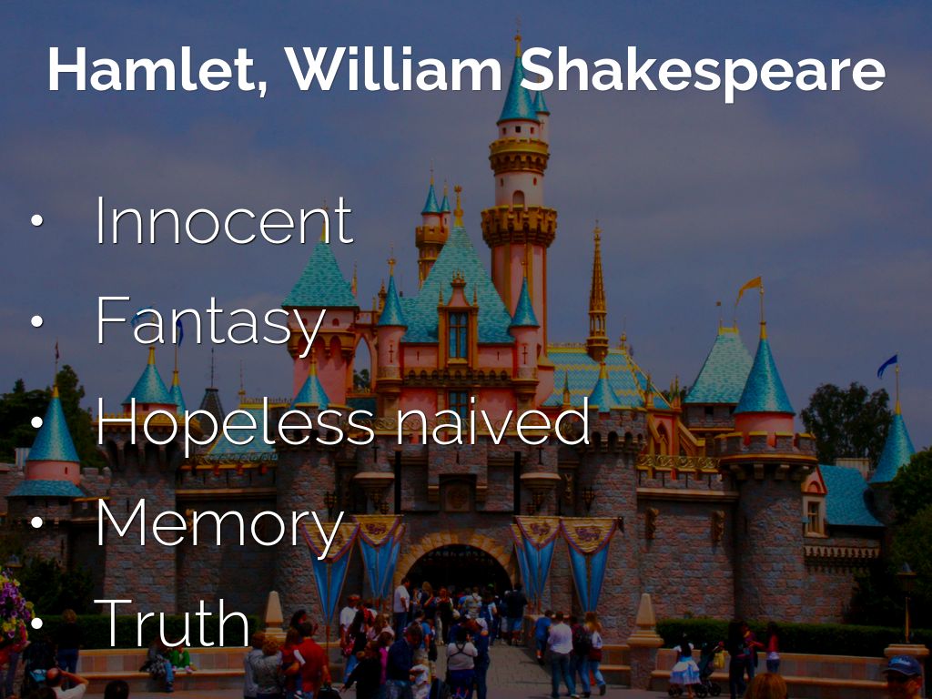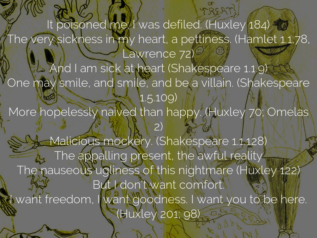 It poisoned me; I was defiled. (Huxley 184) The very sickness in my heart, a pettiness. (Hamlet 1.1.78, Lawrence 72) And I am sick at heart (Shakespeare 1.1.9) One may smile, and smile, and be a villain. (Shakespeare 1.5.109) More hopelessly naived than happy. (Huxley 70; Omelas 2) Malicious mockery. (Shakespeare 1.1.128) The appalling present, the awful reality The nauseous ugliness of this nightmare (Huxley 122) But I don't want comfort. I want freedom, I want goodness. I want you to be here. (Huxley 201; 98)