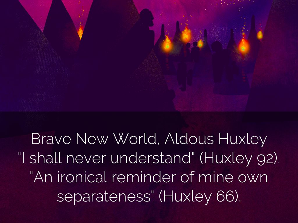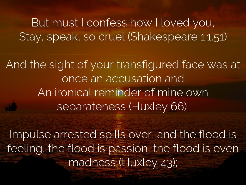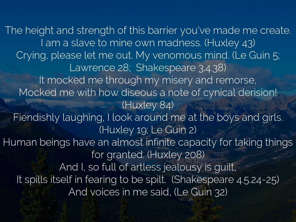 The height and strength of this barrier you’ve made me create. I am a slave to mine own madness. (Huxley 43) Crying, please let me out. My venomous mind. (Le Guin 5; Lawrence 28; Shakespeare 3.4.38) It mocked me through my misery and remorse, Mocked me with how diseous a note of cynical derision! (Huxley 84) Fiendishly laughing, I look around me at the boys and girls. (Huxley 19; Le Guin 2) Human beings have an almost infinite capacity for taking things for granted. (Huxley 208) And I, so full of artless jealousy is guilt, It spills itself in fearing to be spilt. (Shakespeare 4.5.24-25) And voices in me said, (Le Guin 32)