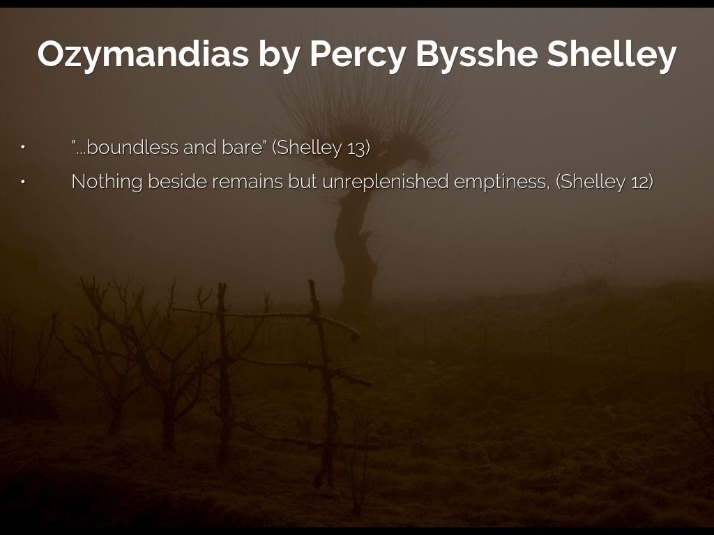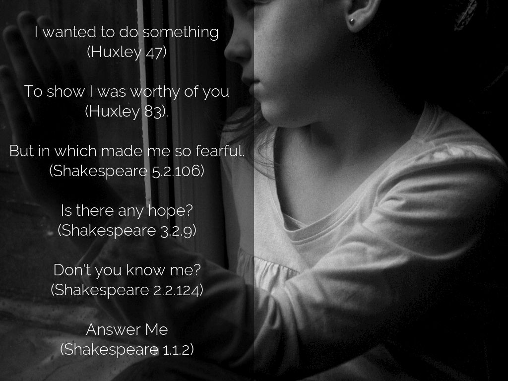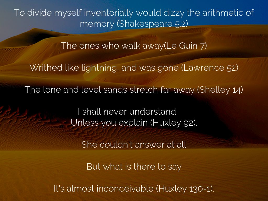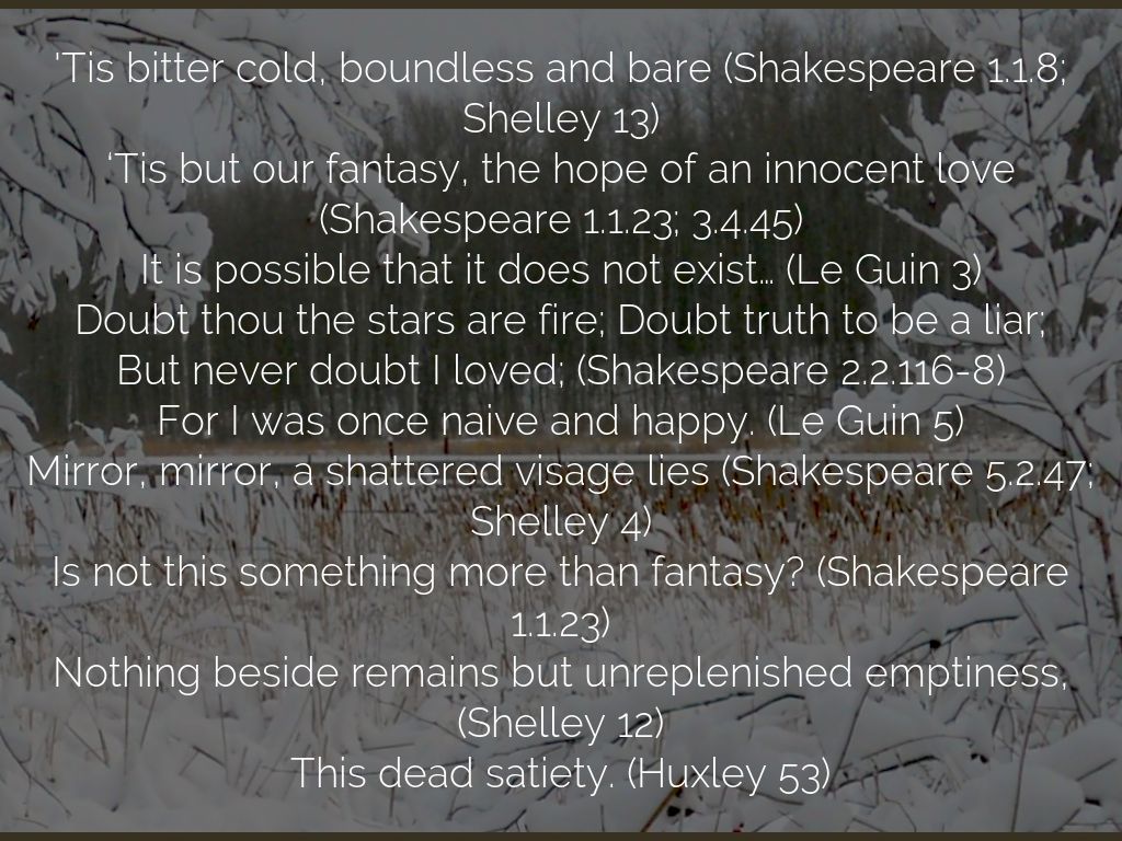 'Tis bitter cold, boundless and bare (Shakespeare 1.1.8; Shelley 13) ‘Tis but our fantasy, the hope of an innocent love (Shakespeare 1.1.23; 3.4.45) It is possible that it does not exist… (Le Guin 3) Doubt thou the stars are fire; Doubt truth to be a liar; But never doubt I loved; (Shakespeare 2.2.116-8) For I was once naive and happy. (Le Guin 5) Mirror, mirror, a shattered visage lies (Shakespeare 5.2.47; Shelley 4) Is not this something more than fantasy? (Shakespeare 1.1.23) Nothing beside remains but unreplenished emptiness, (Shelley 12) This dead satiety. (Huxley 53)