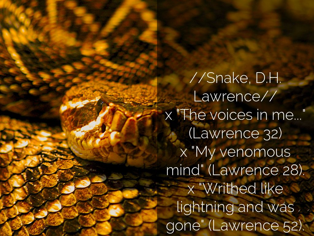 //Snake, D.H. Lawrence// x "The voices in me..." (Lawrence 32) x "My venomous mind" (Lawrence 28). x "Writhed like lightning and was gone" (Lawrence 52).