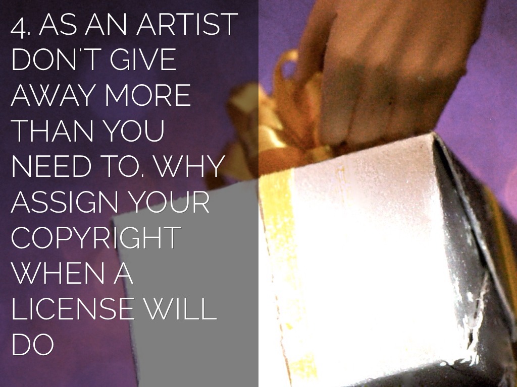 4. AS AN ARTIST DON'T GIVE AWAY MORE THAN YOU NEED TO. WHY ASSIGN YOUR COPYRIGHT WHEN A LICENSE WILL DO