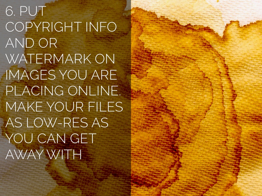 6. PUT COPYRIGHT INFO AND OR WATERMARK ON IMAGES YOU ARE PLACING ONLINE. MAKE YOUR FILES AS LOW-RES AS YOU CAN GET AWAY WITH