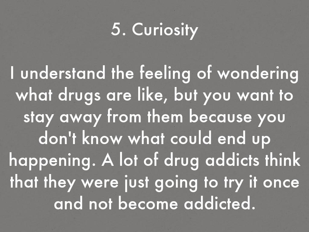 I understand the feeling of wondering what drugs are like, but you want to stay away from them because you don't know what could end up happening. A lot of drug addicts think that they were just going to try it once and not become addicted.