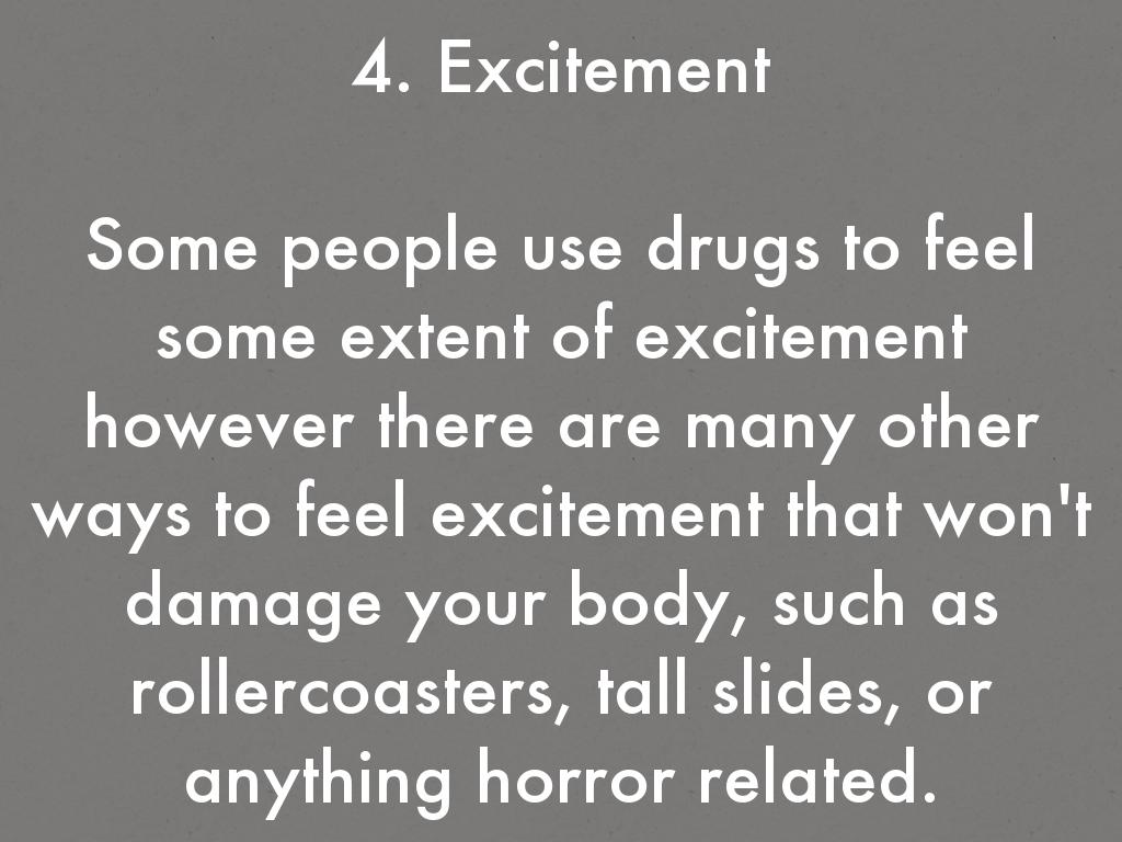 Some people use drugs to feel some extent of excitement however there are many other ways to feel excitement that won't damage your body, such as rollercoasters, tall slides, or anything horror related.