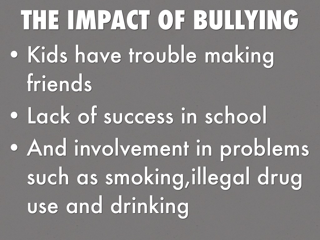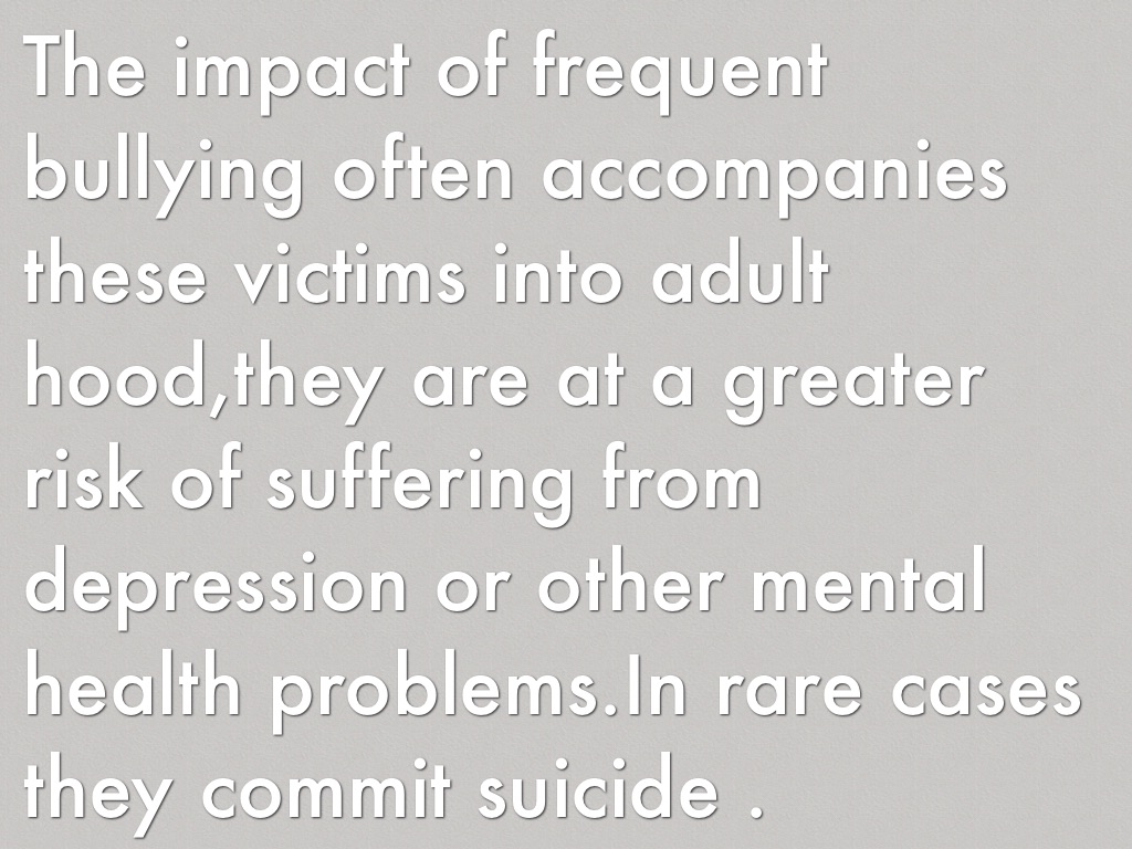 The impact of frequent bullying often accompanies these victims into adult hood,they are at a greater risk of suffering from depression or other mental health problems.In rare cases they commit suicide .