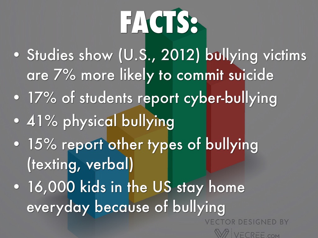 - Studies show (U.S., 2012) bullying victims are 7% more likely to commit suicide