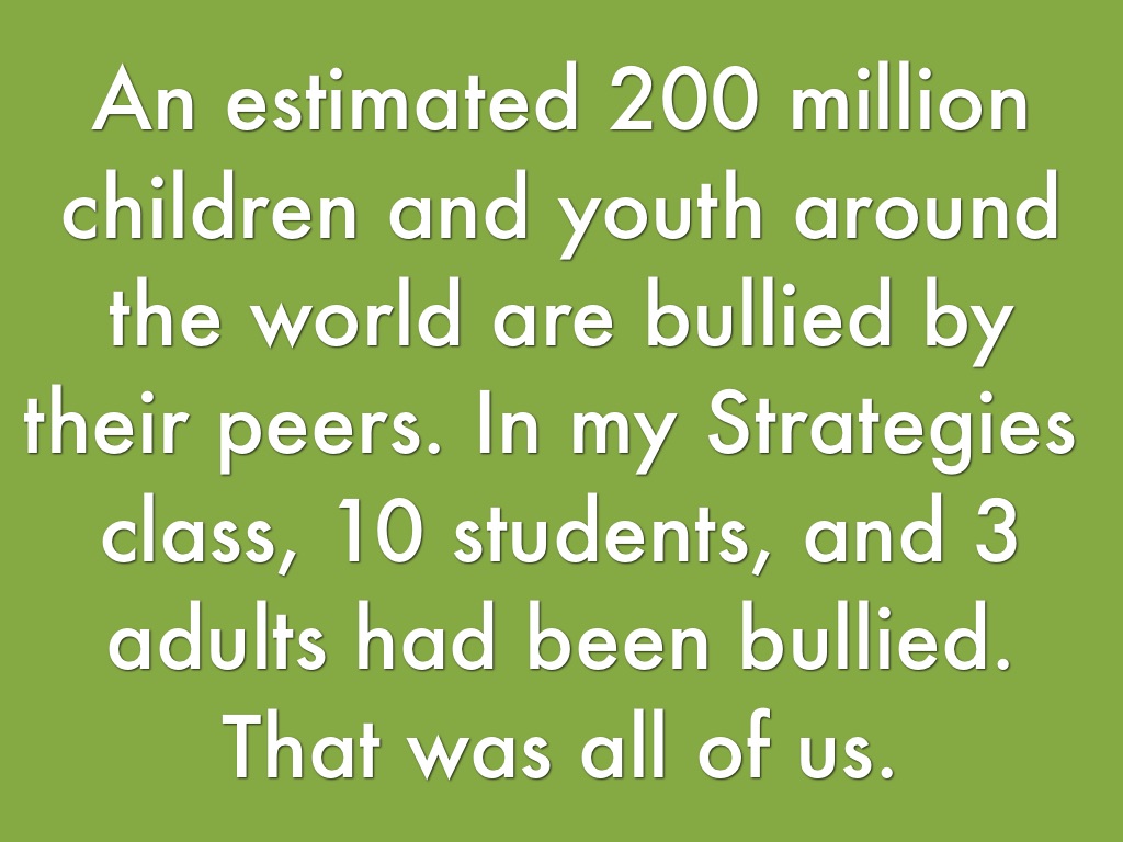 An estimated 200 million children and youth around the world are bullied by their peers. In my Strategies class, 10 students, and 3 adults had been bullied. That was all of us.