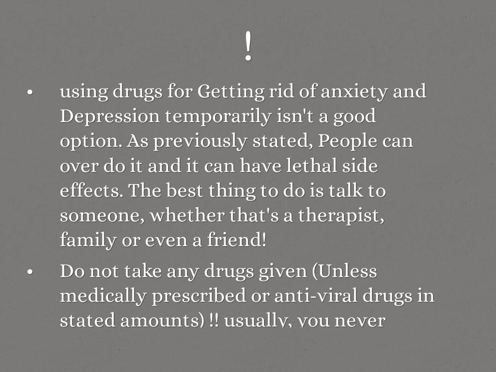 using drugs for Getting rid of anxiety and Depression temporarily isn't a good option. As previously stated, People can over do it and it can have lethal side effects. The best thing to do is talk to someone, whether that's a therapist, family or even a friend!