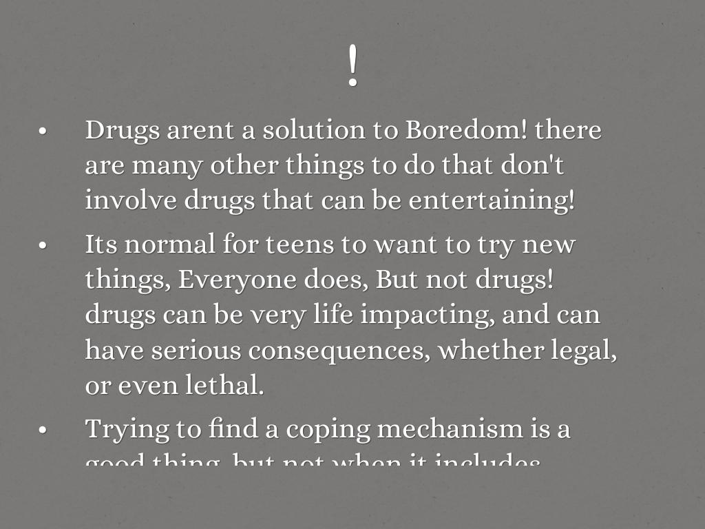 Drugs arent a solution to Boredom! there are many other things to do that don't involve drugs that can be entertaining!