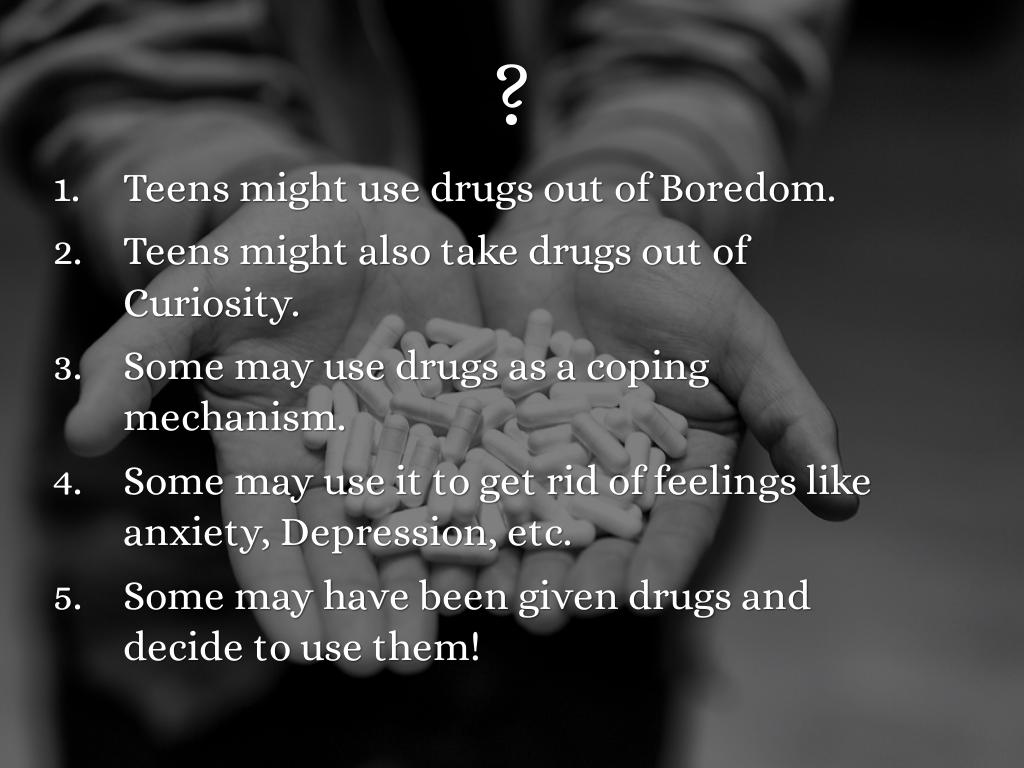 Its normal for teens to want to try new things, Everyone does, But not drugs! drugs can be very life impacting, and can have serious consequences, whether legal, or even lethal.